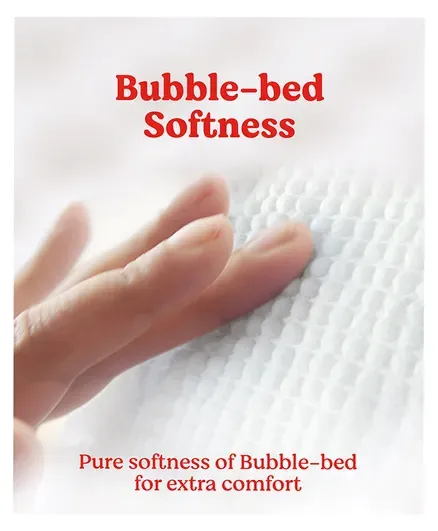 Choosing the best diaper for your baby's delicate and soft skin is important. This next generation Huggies product is India's 1st Diaper Pant with unique Bubble-Bed Technology. Bubble wala Huggies has 3 unique features that provide ultimate care and comfort on all 3 sensitive areas baby's bottom, thighs and waist. The super soft 3-D Bubble-Bed feels like a cottony bed against baby's bottom, absorbing wetness up to 12 hours and keeping your little one's bottom dry and rash-free. These breathable diaper pants are perfect for a peaceful, undisturbed sleep without irritation on skin. The super-flexible waistband offers a snug fit, so baby can move around without any red marks or discomfort around the waist. The triple Leak-guard adds an extra padding on the sides of the diaper for leakage protection from the sides. Fun shapes and playful designs adorn the diaper pants, which are available online in all sizes Newborn, Small, Medium, Large, XL, XXL, XXXL